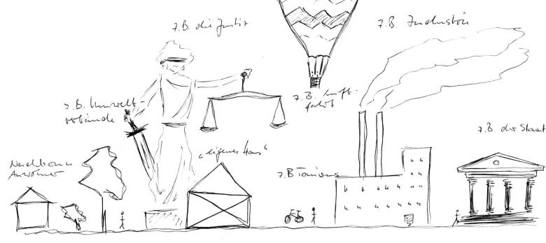 b. Fangen Sie im oberen Bereich frei an zu Zeichnen/Malen. Finden Sie dabei Symbole für Ihre Stakeholder (z.B. Baum = Forst, Verein zum Schutz des Waldes, ...; Justizia = gesetzliche Vorgaben, Prüfstellen, Ministerien, ...; Fabrikgebäude = Wirtschaft, ansässige Konzerne, bestimmte Unternehmen, ...).