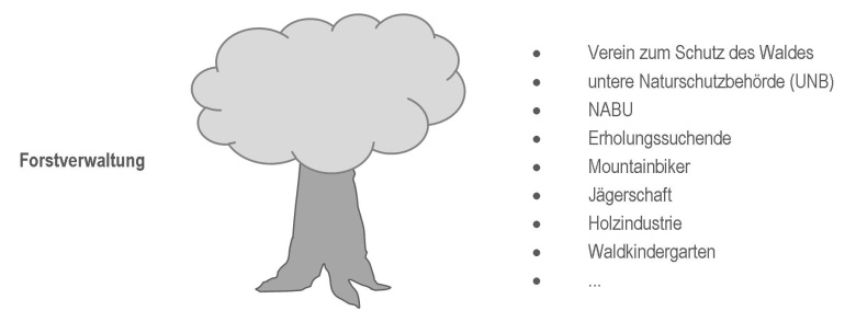 Mit dem Symbol für einen bestimmten Stakeholder lassen sich leicht verschiedene andere Stakeholder assoziieren. So kann man als Ursprünglichen Stakeholder vielleicht die Forstverwaltung identifiziert haben. Hierfür findet sich das Symbol Baum. Mit diesem Symbol verbinden andere Teammitglieder vielleicht außerdem den Verein zum Schutz des Waldes, den NABU, Erholungssuchende, die Jägerschaft, die Holzindustrie, einen Waldkindergarten, ... Sie sehen: es schießt ins Kraut – und das soll es auch.
