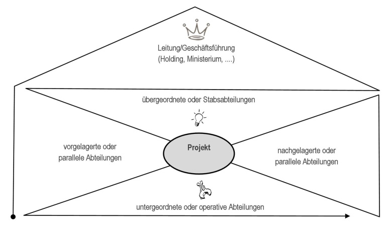 Oberhalb und unterhalb Ihres Projektes können Sie beispielsweise hierarchisch über- bzw. untergeordnete Abteilungen oder Stellen benennen. Über dem „Erdgeschoss“ thronen hierarchisch herausragende Stellen, die Gesamtleitung des Unternehmens, eine Holding oder irgendeine andere Gruppe, die die gesamte Organisation umspannt.